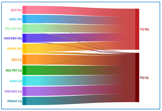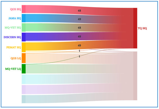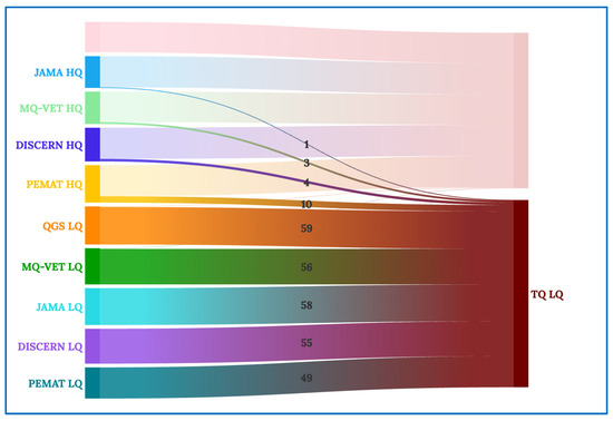 Figure 4 shows the entire Sankey diagram, with the quality scales examined on the left (DISCERN, GQS, MQ-VET, JAMA, and PEMAT), followed by an “HQ” for high-quality videos grouped according to that scale or an “LQ” for low-quality movies grouped according to that scale. The two primary clusters on the right of the diagram are used to classify videos as high (HQ) or low (LQ) quality based on their total quality (TQ) score.