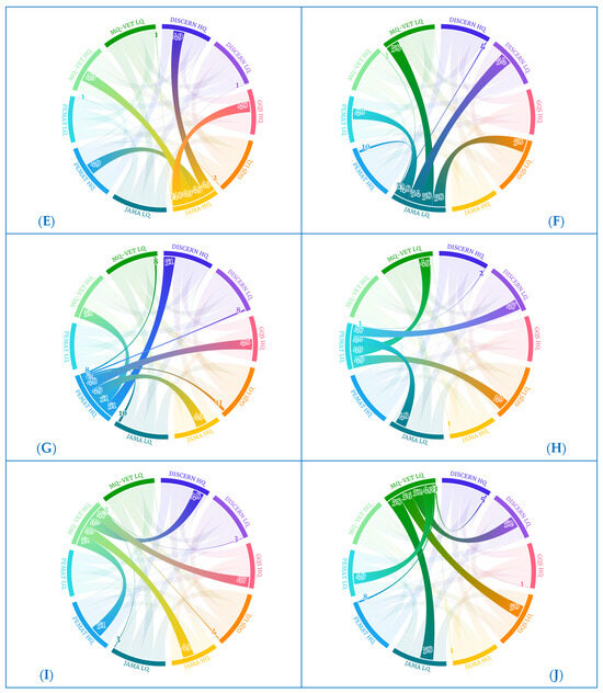 Collectively, the comprehensive statistical correlation analysis, combined with the visual clarity offered by the chord diagrams, underscored the substantial interrelationships and strong agreement among these quality rating scales. As depicted in Figure 7, the chord diagrams for high-quality (HQ) scores on the quality scales (Figure 7A,C,E,G,I) featured wide bands, signifying that the majority of videos receiving high ratings on one scale also received high ratings on the other scales. Conversely, chord diagrams for low-quality (LQ) scores (Figure 7B,D,F,H,J) exhibited broad bands with low-quality scores on the other scales and, in some cases, displayed thin bands or no bands at all with high-quality scores. This visual representation further underscores the consensus and alignment among the different quality rating scales employed in our study.