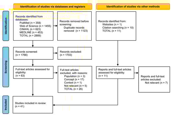 After screening and selecting the 2889 records extracted from scientific databases and 11 documents obtained from other sources, it was decided to include 41 documents in the literature review (Figure 1).