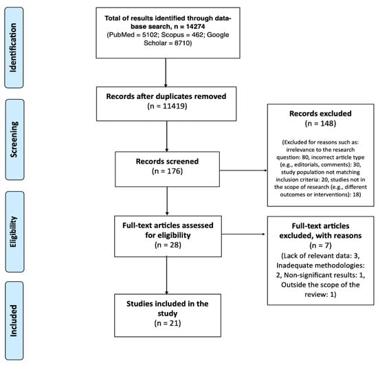 Incorrect article types included those that were purely theoretical without empirical data, or were editorial opinions rather than research studies. The full text of 176 studies was evaluated. From these, 148 were excluded after reviewing the titles and abstracts for reasons such as irrelevance to the research question, incorrect article type, and non-conforming study populations. Following a more detailed examination, 7 articles were excluded due to lack of relevant data (n = 3), inadequate methodologies (n = 2), non-significant results (n = 1), and being outside the scope of the review (n = 1). Ultimately, 21 studies met the inclusion criteria and were included in the review.
