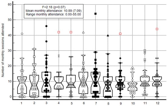 Monthly attendance Box-and-Whisker plot. Notes: The horizontal axis represents the activity month out of the 12-month program; The central box represents the values from the lower to upper quartile (25–75 percentiles); the vertical line extends from the minimum to the maximum value, excluding outside values which are displayed as separate points. An outside value is defined as a value that is smaller than the lower quartile minus 1.5 times the interquartile range, or larger than the upper quartile plus 1.5 times the interquartile range; the middle line represents the median.
