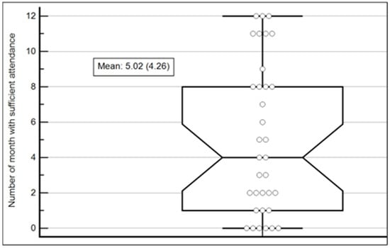 As seen in Figure 1, the monthly attendance per participant varied greatly, ranging from 0 to 55 sessions. The mean monthly attendance for all participants was 10.89 ± 7.09. In the following stage of analysis step, the number of months with sufficient attendance was calculated, resulting in a mean number of months with sufficient attendance of 5.02 ± 4.26. This means, on average, each participant sufficiently participated in the activities in 5.02 months. However, the range of the sufficient activity months was 0 (6 participants) to 12 months (3 participants). Figure 2 depicts the summary statistics of the attendance variable.