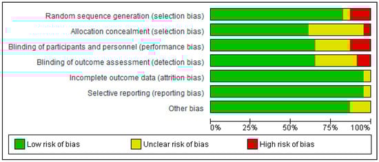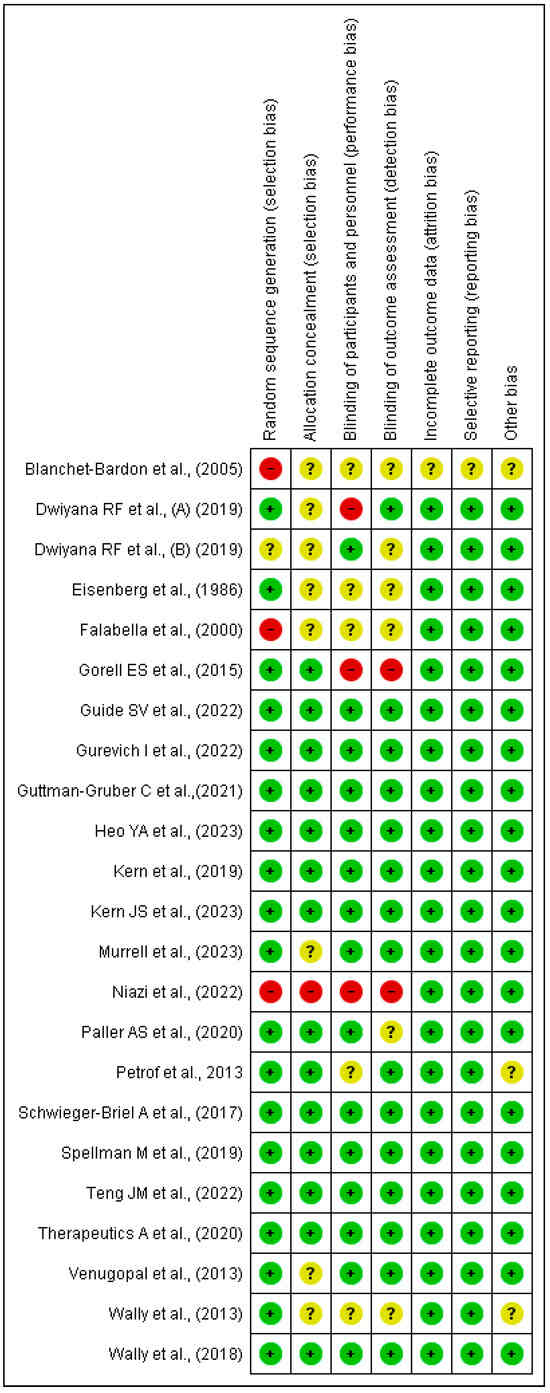 The Cochrane Risk of Bias Tool [31] was used, categorising the level of risks into three levels: low, high, or unclear. These risks included random sequence generation, allocation concealment, blinding of participants and personnel, blinding in outcome assessment, integrity of outcome data, selective reporting, and other potential sources of bias. Studies without a high risk of bias in any category were classified as high quality (1++), those with a high risk or two unclear risks as medium quality (1+), and others as low quality (1−).