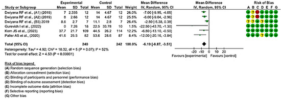 Statistically significant differences were found between the two groups. A MD of −6.19 was obtained, with a 95% confidence interval of −8.87 to −3.51 (p < 0.001), and significant heterogeneity among the studies (I2 = 52%, p < 0.07) (Figure 4). This seems to indicate that existing topical treatments tend to reduce the healing time of wounds in individuals with EB.