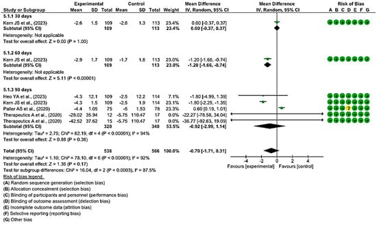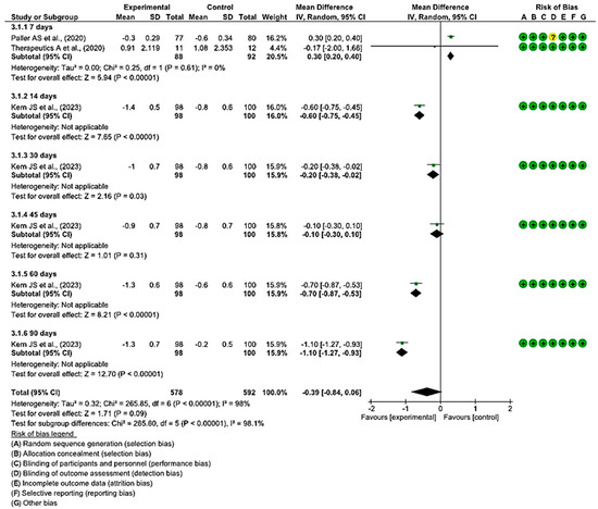 Finally, a MD of −0.70 was obtained, with a 95% confidence interval of −1.71 to 0.31 (p < 0.17), and significant heterogeneity between the studies (I2 = 92%, p < 0.001) (Figure 7). These results suggest that there is not enough evidence to determine whether topical treatments are effective in increasing BSA scores within a specified time when compared with the control group.