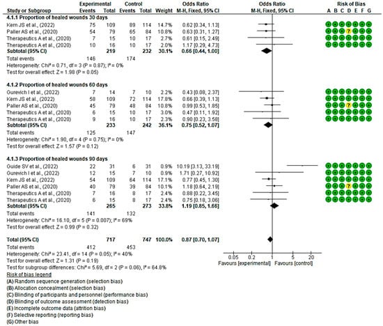 In six clinical trials involving 538 participants, 265 in the intervention group and 273 in the control group, the efficacy of topical treatments was evaluated in the proportion of healed wounds within a specified timeframe. Five studies showed a low risk of bias [43,44,47,54], while the remaining study exhibited a moderate risk of bias [51].