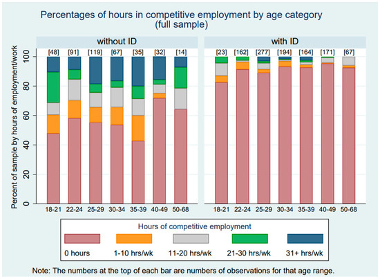 Table 3 presents the hours of competitive employment by ID status across the waves of the study. The averages in Table 3 include 0 h for those who were not competitively employed during a given study wave. The last row of Table 3 indicates the average number of hours of competitive employment across all waves of the study period. Adults without ID averaged just over 9 h of competitive employment per week, and those with ID averaged 1.4 h of competitive employment per week. When data from those who were never employed were removed, those without ID averaged 21 h per week across all waves of the study, whereas those who had ID averaged 17 h per week. Thus, autistic adults with and without ID differed more in their likelihood of competitive employment than in the hours they worked once a job was obtained. Figure 1 and Figure 2 display these data graphically. Figure 1 displays the hours of competitive work by age category and ID status for the full sample, including those who were never competitively employed (i.e., had 0 h of competitive employment). Figure 2 similarly displays hours of competitive work by age category and ID status, but only includes those autistic adults who worked competitively for at least one wave of data collection during the study period.