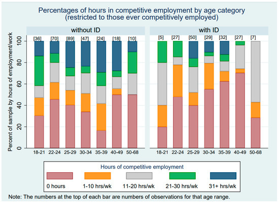 Hours of competitive work by age category and ID status for those who ever worked.