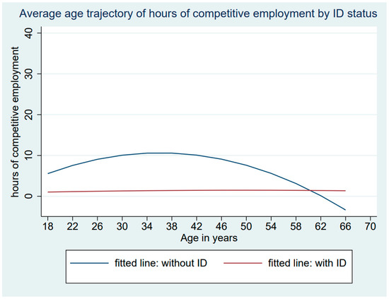 Table 4 presents the growth curve data for Model 5, indicating that the associations between age and hours spent in competitive work were quadratic and differed for those with and without ID (age × ID coefficient = 0.015, p = 0.001). As descriptively illustrated in Figure 3, those without ID showed a curvilinear pattern of hours of competitive work (age coefficient = −0.016, p < 0.001), peaking at just over 10 h per week around the mid-30s and then decreasing again. Those with ID did not change their engagement in competitive work across the life course (age coefficient = −0.000, p = 0.840), which remained low from adolescence into adulthood and late midlife.