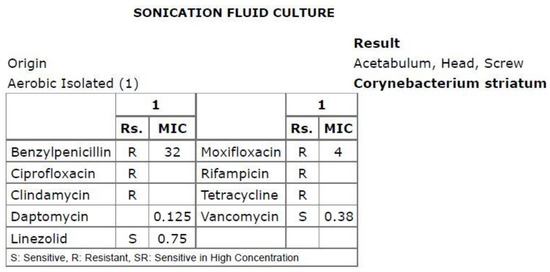 Contrariwise, 15 days postoperatively, sonication of the implants denoted growth of small, white, and smooth colonies (>100 cfu/mL), which were Gram-positive bacilli with typical coryneform morphology. Identification was carried out employing the API Coryne (bioMérieux, Marcy l’Etoile, France), and MALDI-TOF MS (Microflex LT, Bruker Daltonics, Bremen, Germany Bruker Biotypes, Germany) systems, and the isolate was recognized as Corynebacterium striatum. It was a strikingly unanticipated result and PJI pathogen.