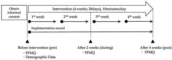 Study protocol. The intervention consisted of a 10-minute daily self-breathing practice over four weeks. Basic attributes (age, sex, occupation, and subjective stress level) data were collected at the baseline, while FFMQ scores were measured before (pre) the intervention, after 2 weeks (during), and 4 weeks (post) after the intervention started. Participants recorded the date and time of their training throughout the intervention period, and implementation records were collected at the end of the intervention. FFMQ, the Japanese version of the Five Facet Mindfulness Questionnaire. MT, mindfulness-based training.