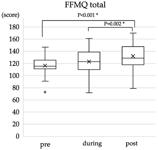 Changes in total FFMQ scores before (pre), during, and after (post) the intervention (n = 22). FFMQ, the Japanese version of the Five Facet Mindfulness Questionnaire. The cross marks and the horizontal line indicate the mean and the median, respectively. The range of the total score is 39–195. The asterisk indicates a p-value lower than 0.01 (p < 0.01).