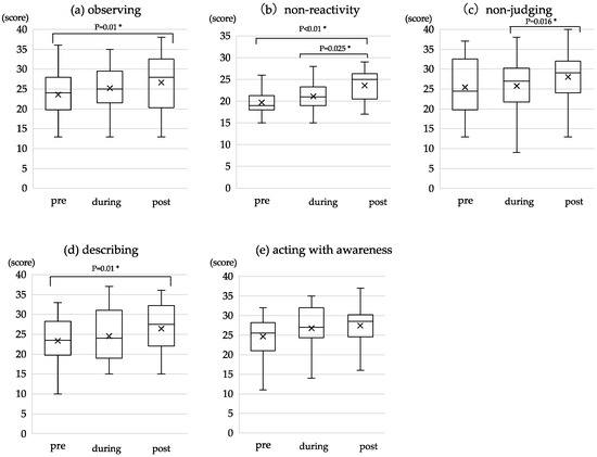 Change in FFMQ sub-scores during the intervention period (n = 22). Changes in scores for (a) Observing, (b) Nonreactivity, (c) Nonjudging, (d) Describing, and (e) Acting with awareness. Pre, before the intervention; during, two weeks after the start of the intervention; post, four weeks after the start of the intervention. The cross marks and the horizontal line indicate the mean and the median, respectively. The asterisk indicates a p-value lower than 0.05 (p < 0.05). The range of scores is as follows: (a) Observing (8–40), (b) Nonreactivity (7–35), (c) Nonjudging (8–40), (d) Describing (8–40), and (e) Acting with awareness (8–40).