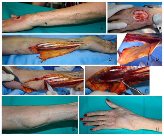 An 80-year-old lady affected by breast cancer sustained a soft tissue necrosis of the dorsum of the hand due to chemotherapy extravasation. (A) Skin integrity restoration was needed short-term to continue the treatments. After debridement (B), a reverse ulnar pedicled perforator flap (Becker flap) was harvested (C,D) to cover the medium-sized defect of the dorsum of the hand. The donor site defect (E) was partially restored with a propeller flap based on a proximal perforator of the ulnar artery (F). After 12 months’ follow-up, good healing was obtained on the hand (H) and donor site (G).