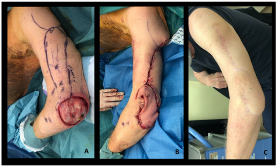 - Adkinson, J.M.; Chung, K.C. Flap reconstruction of the elbow and forearm: A case-based approach. Hand Clin. 2014, 30, 153–163. [Google Scholar] [CrossRef]