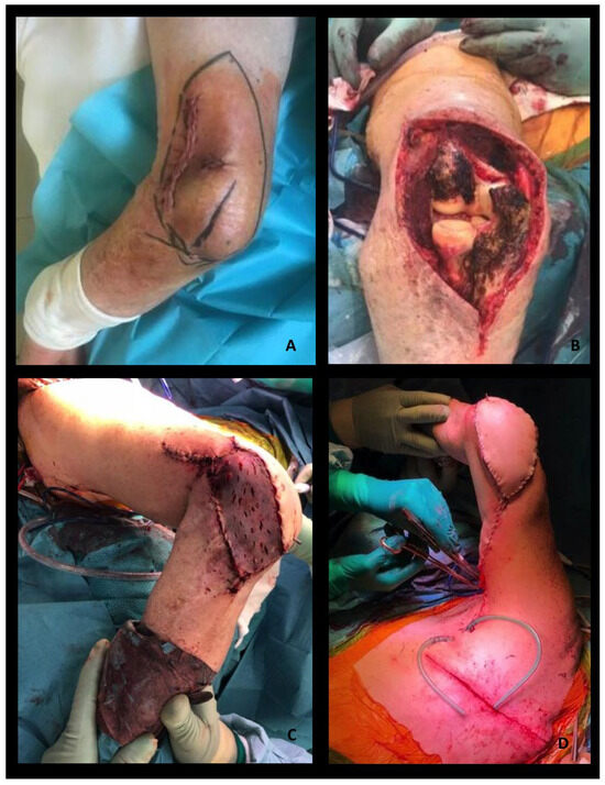 An 89-year-old man was referred to us for recurrence of sarcoma of the left elbow. Previous surgeries and adjuvant radiotherapy had caused extensive scar retraction, severe contraction, and stiffness of the elbow, with an 80% reduction in upper extremity function. (A) After a further surgical wide excision and the prosthetic joint replacement of the elbow (B), an ipsilateral Latissimus Dorsi (LD) myocutaneous pedicled flap was transposed for arthroplasty coverage and soft tissue reconstruction. The myocutaneous flap was harvested with a transverse skin island (19 cm × 10 cm). (C,D) The thoracodorsal pedicle was isolated to its origin to increase the flap transposition. The thoracodorsal nerve was preserved to ensure muscle trophism and adequate muscular thickness. A subcutaneous tunnel under the skin of the axilla and medial aspect of the left arm was dissected to transpose the flap on the wide surgical defect. LD muscle was used to cover the elbow prosthesis. The bulkiness of the skin paddle was used to reinforce the coverage of the prosthesis. (D) A split thickness skin graft was needed to completely cover the transposed LD muscle. (C) To avoid pedicle compression or strain, postoperatively, the shoulder was immobilized in 45 degrees of abduction for 3 weeks. Postoperative rehabilitation improved the final outcome and the joint function recovered well. Three months after surgery, the patient died of an acute ischemic stroke.