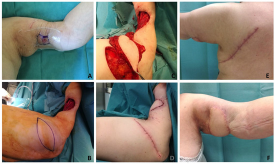A 74-year-old woman, who had previously undergone surgical resection and adjuvant radiotherapy, presented with recurrence of leiomyosarcoma of the medial aspect of the left arm. (A) After a further surgical wide excision, an ipsilateral LD myocutaneous pedicled flap was transposed for radial nerve and brachial vessels coverage and for soft tissue reconstruction after biceps brachii and coracobrachialis muscle sacrifice. (B) The myocutaneous flap was harvested with a transverse skin island (21 cm × 9 cm). (C) The thoracodorsal nerve was preserved to maintain muscle trophism. The flap was tunneled under the axillary skin bridge to reach the arm defect (C), restoring adequate upper limb contour. (D) Postoperatively, the shoulder was immobilized in 45 degrees of abduction to avoid pedicle injury. Physical rehabilitation started 45 days after the reconstructive surgery, reporting more than 140 degrees of left arm abduction. The postoperative stay was uneventful, and the patient kept a stable soft tissue reconstruction at a 3-year follow-up, without recurrence (E,F).