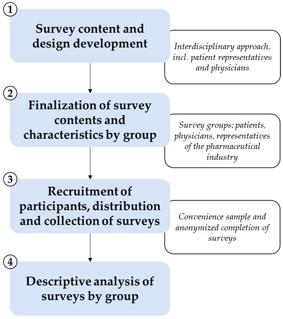 Overview of survey development, distribution, and analysis. Four main steps were undertaken for the development and implementation of the exploratory study: (1) survey content development and design of the survey with an interdisciplinary approach, including patient representatives and physicians; (2) finalization of the survey along with the characteristics and content of the surveys by group (patients, physicians, representatives of the pharmaceutical industry); (3) recruitment of participants and distribution of the survey (convenience sample) to patients, physicians, and representatives of the pharmaceutical industry and collection of completed (anonymized) surveys (incl. ethical and data protection issues); (4) descriptive analysis of surveys by group (patients, physicians, and representatives of the pharmaceutical industry).