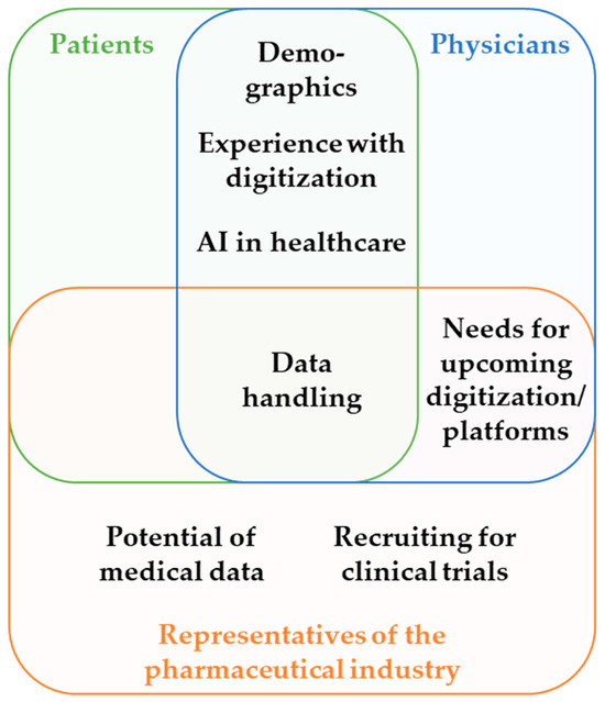 Survey content topics by group. All three groups had one topic in common: data handling. Patients and physicians shared three main topics: demographics, experience with digitization, and AI in healthcare. Physicians and representatives of the pharmaceutical industry were both asked about their needs for upcoming digitization/platforms. Topics included in the surveys for representatives of the pharmaceutical industry but not for physicians or patients were the potential of medical data and recruiting for clinical trials.