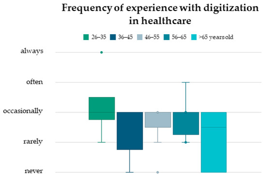 The youngest age group (26–35) reported the highest frequency of experience with digitization in healthcare, with an average range from occasionally to often (Figure 3). In the older age groups, the average frequency ranged between occasionally and never, and no statistically significant differences were observed between age groups.