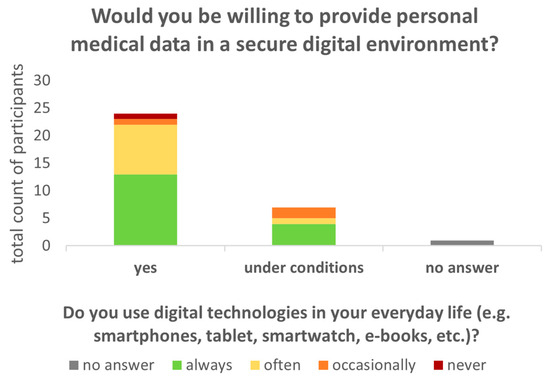 The willingness to provide medical data in a digital environment exhibited a range of responses, from affirmative to reserved (“yes” or “under conditions”). However, this willingness did not appear to be contingent on the extent to which patients utilized digital technologies in their daily lives (Figure 4). Overall, it is notable that none of the patients expressed a complete rejection of the concept of sharing their medical data. Rather they indicated either agreement or partial agreement, contingent upon specific conditions such as maintaining anonymity or limiting the scope of data shared to certain information.