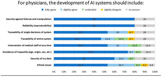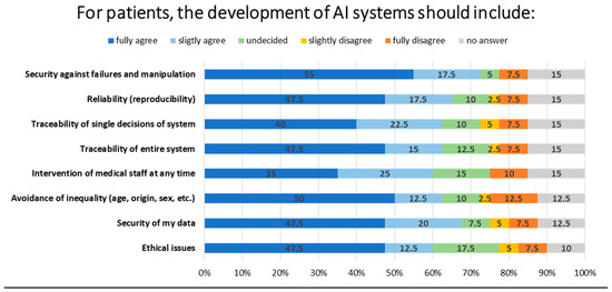 The majority of patients (50% and 47.5%, respectively) identified the fair use of AI (e.g., no discrimination by gender, age, origin, etc.) and ethical issues as important considerations for the development of AI systems. The respondents indicated that the traceability of the entire system (47.5%), the security of data (47.5%), the possibility of intervention by physicians at any time (47.5%), reliability (47.5%), and security against failures and manipulation (55%) were the most important factors (Figure 5).
