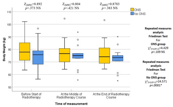 Patients in this study were assessed for various nutritional parameters at different time points during their radiotherapy (RT) course. The first assessment took place at the beginning of the RT course, corresponding to the first week of treatment. At this time, there were no statistically significant differences between the two groups (ONS and No ONS) in terms of median body weight (77.8 kg vs. 75.70 kg; p = 0.373), BMI (28.2 kg/m2 vs. 28.15 kg/m2; p = 0.254), fat mass (24.5 kg vs. 22.7 kg; p = 0.071), fat-free mass (51.55 kg vs. 55.5 kg; p = 0.556), and bone mass (3.1 kg vs. 3.0 kg; p = 0.188). Therefore, the baseline nutritional status was similar in both groups.