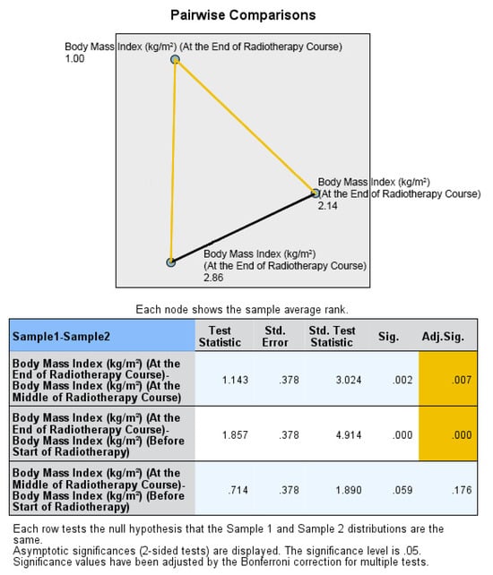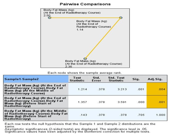 In addition, the percentage alteration of nutritional parameters also exhibited a statistically significant decrease in the group that did not receive oral nutritional supplements (ONS) when compared to the group that did receive ONS after the middle of the radiation therapy (RT) course. The p-values for the changes in body weight percentage and BMI percentage between the middle and baseline, end and middle, and end and baseline of the RT course were found to be 0.851, 0.001, and 0.009, respectively. The percentage change in fat mass demonstrated a significant alteration between the end and middle of the RT course (p = 0.001), while the percentage change in fat-free mass was found to be significant between the end and baseline (p = 0.012). On the other hand, there was no statistically significant alteration observed in the percentage change of bone mass. All the data are presented in the form of Tables (Table 4, Table 5, Table 6, Table 7 and Table 8) as well as in various figures (Figure 1, Figure 2, Figure 3, Figure 4, Figure 5, Figure 6, Figure 7, Figure 8, Figure 9 and Figure 10).