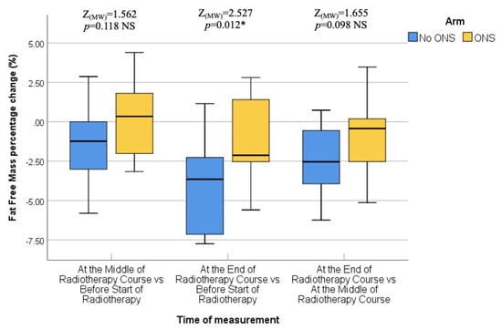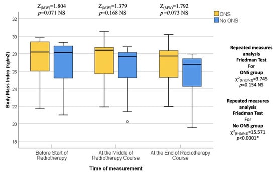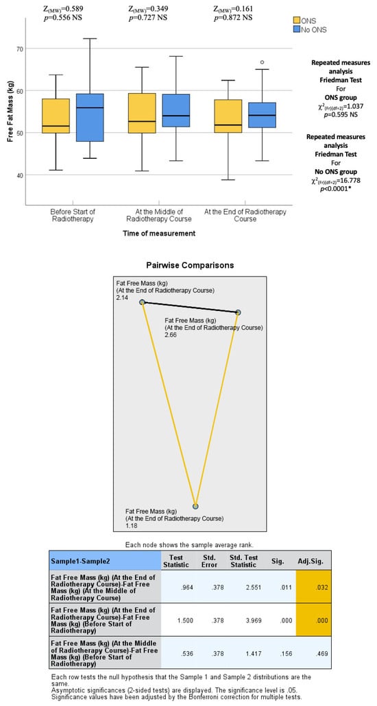 The final assessment was conducted at the end of the RT course, which corresponded to the sixth or seventh weeks into treatment. Similar to the previous assessments, there were no statistically significant differences between the two groups in terms of median body weight (73.90 kg vs. 72.95 kg; p = 0.383), BMI (27.64 kg/m2 vs. 26.34 kg/m2; p = 0.054), fat mass (23.45 kg vs. 19.30 kg; p = 0.073), fat-free mass (52.50 kg vs. 53.60 kg; p = 0.872), and bone mass (3.00 kg vs. 2.95 kg; p = 0.310). Thus, the nutritional status at the end of the RT course was not significantly different between the ONS and No ONS groups. However, when considering the changes over time, the No ONS group showed statistically significant reductions in body weight (p < 0.001), BMI (p < 0.001), fat mass (p < 0.001), fat-free mass (p < 0.001), and bone mass (p = 0.031) throughout the treatment period. On the other hand, the ONS group did not show statistically significant reductions in these nutritional values, despite some reductions being observed.