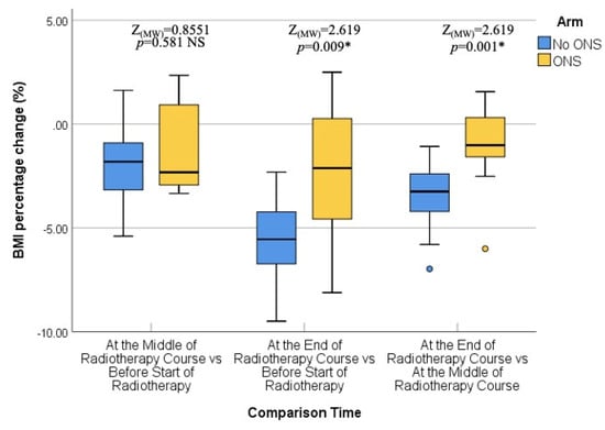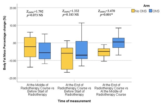 The second assessment was conducted in the middle of the RT course, which corresponded to the third or fourth weeks into treatment. Again, no statistically significant differences were found between the two groups in terms of median body weight (76.1 kg vs. 74.85 kg; p = 0.421), BMI (28.20 kg/m2 vs. 27.37 kg/m2; p = 0.215), fat mass (23.45 kg vs. 20.40 kg; p = 0.168), fat-free mass (53.10 kg vs. 54.00 kg; p = 0.727), and bone mass (3.10 kg vs. 2.95 kg; p = 0.310). Therefore, the middle of the RT course nutritional status was comparable between the ONS and No ONS groups. Moreover, the percentage change or pairwise comparisons of the nutritional assessing parameters from baseline to the middle of the RT course did not show any statistically significant differences.