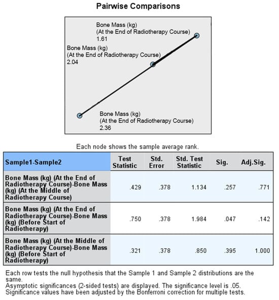 Furthermore, pairwise comparisons within the No ONS group revealed that the loss of nutritional values was particularly evident towards the end of the RT course. The p values for the mid-end of RT vs. the beginning-end of RT comparisons were significant for body weight (0.007 and <0.001), BMI (0.007 and <0.001), fat mass (0.004 and 0.001), and fat-free mass (0.032 and <0.001), indicating a statistically significant deterioration in nutritional status after the middle of the RT course. However, there was no significant reduction in bone mass in the pairwise comparison. Therefore, the results suggest that while the ONS group did not show statistically significant reductions in nutritional values, the No ONS group experienced significant deterioration in nutritional status, especially towards the end of the RT course.