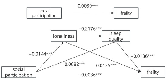 As is shown in Table 2, there was a significant correlation (p < 0.01) between social participation, loneliness, sleep quality and frailty. Social participation was negatively correlated with frailty (r = −0.371, p < 0.01) and loneliness (r = −0.141, p < 0.01) and positively correlated with sleep quality (r = 0.073, p < 0.01). Loneliness was positively correlated with frailty (r = 0.236, p < 0.01) and negatively correlated with sleep quality (r = −0.216, p < 0.01). Sleep quality was negatively correlated with frailty (r = −0.202, p < 0.01).