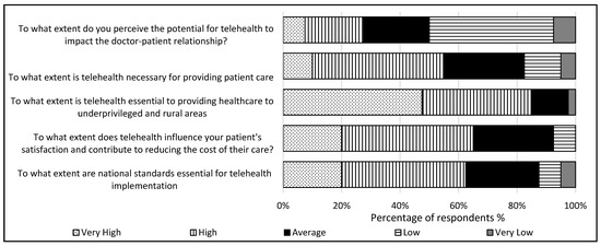 In regions with fewer consultants available, telehealth has mitigated access challenges and enhanced patient access, satisfaction, convenience, and acceptance. The survey results revealed consultants’ considerable appreciation of factors aligning with patient needs. Specifically, 65% agreed that reducing patient costs and enhancing patient satisfaction constitute notable advantages of telehealth (Figure 1). Moreover, 55% perceive telehealth as either highly or very highly necessary for providing oral and maxillofacial healthcare. This sentiment was reinforced by the fact that 85% of the respondents acknowledged that telehealth is essential in delivering quality healthcare to marginalized groups. Additionally, 62.5% highlighted the significance of national standards for oral and maxillofacial telehealth services.