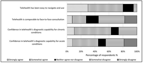 The consultants’ perceptions of telehealth use during COVID-19 revealed that the perceived ease of navigation and their willingness to continue using telehealth were significantly related (p = 0.041), in which the consultants agreeing that telehealth was easy to navigate was associated with them expressing a desire to continue its use (Figure 2).