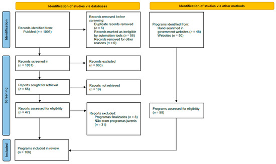 Only PubMed was selected as a scientific search engine, considering the characteristics of the programs, as these services are provided by government and non-profit entities and are not subject to scientific evaluation. Therefore, the research focused on the use of other search engines (e.g., Google) and government websites. Forty-eight programs were identified on government websites and fifty on other websites. Thus, 106 youth programs for promoting health and healthy lifestyles were included.