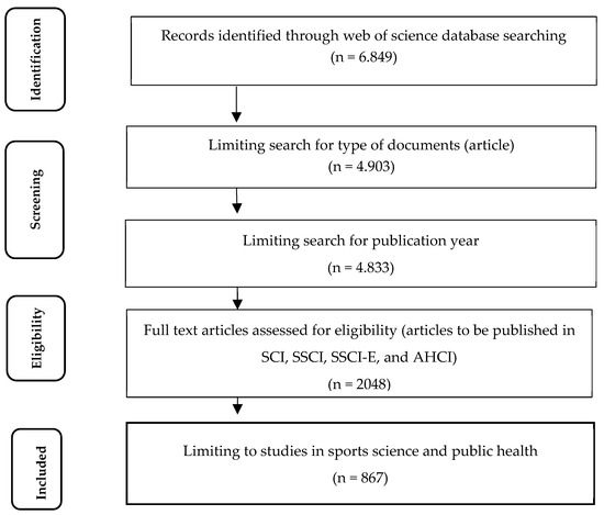 The criterion sampling method, which is considered a purposive sampling method, was used to identify the sample of this study. The study included articles that focused on physical activity barriers among men in the Web of Science database and published in SCI, SSCI, SSCI-E, and AHCI. Therefore, as exclusion criteria, the publication types “book note, editorial material, proceedings paper, letter, and correction” were excluded from the study. Consequently, the analysis was completed with 867 articles (Figure 1).