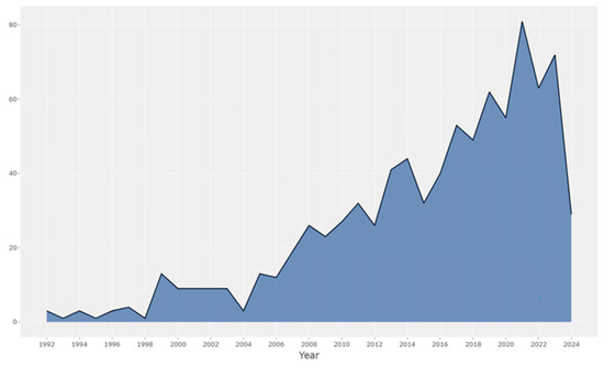 The most productive journal for article publication was “BMC Public Health”, with 40 articles between 1992 and 2024. This journal was followed by the “International Journal of Environmental Research and Public Health”, with 27 articles, and the “American Journal of Men’s Health”, with 25 articles.