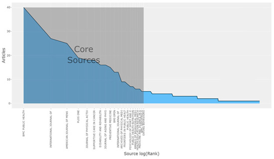 The most cited journal in the references of all articles included in the study was ‘Medicine and Science in Sports and Exercise’ with 845 citations, followed by “Preventive Medicine” with 633 citations, and the ‘American Journal of Preventive Medicine’ with 576 citations. The graphic based on Bradford’s law showing the distribution of the literature on physical activity barriers in men among the journals is presented below (Figure 4).