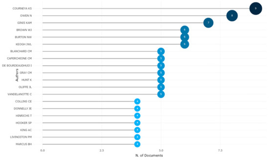 This section analyzes articles on physical activity barriers in men according to relevant bibliometric indicators: average number of citations per article, number of authors per article, number of authors and their appearance, co-authors per article, and the authors’ collaboration index. Moreover, the annual publication productivity of the authors and the citation averages, which are related to the number of citations in the studies according to the years of publication, were calculated.