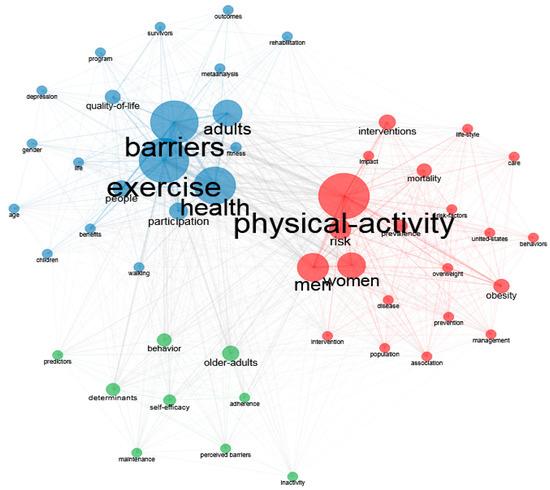 In Figure 8, the size of the circle is proportional to the total frequency of the KWP included in that cluster. In this sense, when the sizes of the circles in Figure 8 were analyzed, “Physical activity” was found to be the most recurrent keyword.