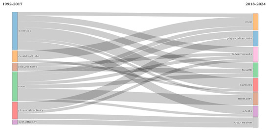 According to the time periods set out in the figure above, exercise, the most popular keyword between 1992 and 2017, evolved toward men, physical activity, determinants, and health, while maintaining its popularity (Figure 9).