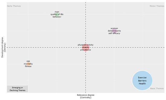 Figure 10 represents the centrality (i.e., the degree of interaction of a network cluster compared to the other clusters) of the X-axis and provides information about the importance of a theme. The y-axis symbolizes density (i.e., measures the internal strength of a cluster network and can be considered as a measure of theme development). According to Figure 10, it was found that the themes in the upper-right quadrant (women’s determinants of self-efficacy) showed development on physical activity barriers and were important for constructing the research area. These themes were the motor themes of the subject area of physical activity barriers, had high internal consistency, and were conceptually closely correlated with each other. In the lower-right quadrant, it was identified that the important and basic themes for physical activity barriers were correlated to health. In the upper-left quadrant, the marginal themes were identified as men, quality of life, and behavior, while the themes just below (lower-left quadrant), which are known to be both poorly developed and marginal, were identified as risk, mortality, and fitness.