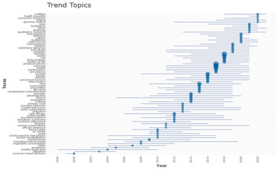 When Figure 11 was analyzed, it was observed that the studies on the physical activity barriers in men after 2020 were mainly concentrated on the trending topics associated with mellitus, health benefits, university students, stigma, and glycemic control.