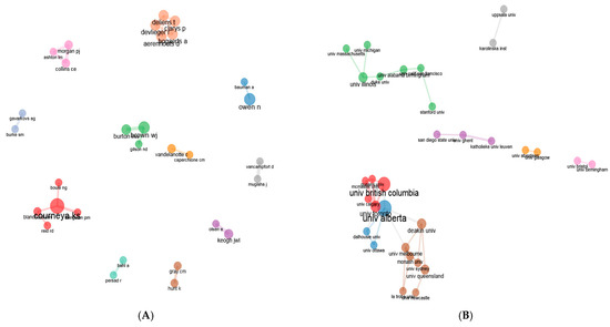 In the bibliometric mapping study, the nodes in the network show the authors, institutions, and countries, as well as the links between them show their collaborations. The size and thickness of the circle around the nodes in the network in the images indicate the degree of centrality of that actor in the network. In the social structure of 867 articles, there was one different cluster of authors (Figure 12). “Courneya” was the most prolific author. On the other hand, seven different clusters of institutions were established, with “University British Columbia” in cluster 1, “University Alberta” in cluster 2, and “University Illinois” in cluster 3.