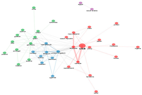 The international collaboration of countries in the research field was quite intense (Figure 14). Many studies have been conducted with international collaboration on physical activity barriers in men. The USA and Canada had the highest number of international collaborations. The links between these countries and other countries are also noticeable on the map. The top three collaborations among the countries in the dataset of 867 articles concerned the United States–Canada, Canada–Australia, and England–Canada.