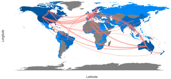 Social network analysis, also known as network mapping, is a method used to examine network centralization by analyzing nodes and links [23]. In a scientific collaborative network, articles, sources, authors, institutions, or countries represent nodes and co-authors represent links. This is also one of the best-documented forms of scientific collaboration [24]. In order to avoid isolated and “one-off” collaborations in the collaborative network between authors, institutions, or countries, the Louvain method was adopted as the clustering algorithm, the number of nodes was set to 50, and the minimum edge strength was set to 2. Isolated nodes were removed. Finally, collaboration world map analysis was used to demonstrate the social structure. This analysis mainly aims to observe the collaboration and networks across countries. Countries with darker shades publish more than countries with lighter shades. Countries shaded grey indicate that no studies have been produced in that country. The lines indicate the collaboration across countries [25].