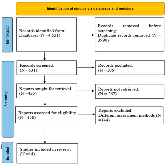 From the initial 4521 documents identified, duplicates were removed, leaving 531articles for preliminary screening based on titles and abstracts. Of these, 106 articles were excluded at this stage, leaving 425 papers for further detailed eligibility assessment. After a comprehensive review of the full texts, 14 studies met all inclusion criteria and were selected for inclusion in this systematic review. The entire selection process, along with reasons for exclusion at various stages, is meticulously documented in a PRISMA flowchart (Figure 1), which will be included in the final report to ensure transparency and reproducibility of the review process.