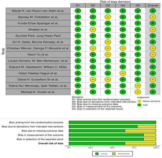 The risk of bias assessment for the studies included (Figure 2) in this review generally indicates a low risk across most evaluated domains, underscoring the methodological rigor employed in the majority of the research [34,35,36,37,38,39,40,41,42,43,44,45,46,47]. Notably, several studies, such as those by Marije N. van Doorn-van Atten et al. and Funda Ertas-Spantgar et al., maintained a consistent low-risk profile across all domains, likely reflecting strong random sequence generation, proper allocation concealment, and effective blinding of outcome assessments. However, certain studies like those by Stanley M. Finkelstein et al. and Shaban et al. demonstrated some concerns, particularly in domains related to the blinding of participants and personnel, which could introduce performance and detection biases. More pronounced concerns were evident in studies by Christian Werner, George P. Moustris et al., and David H. Gustafson Sr et al., where multiple domains raised issues, especially around blinding and allocation, indicating potential impacts on the study’s findings due to possible biases in participant behavior and outcome reporting. This varied risk profile across studies highlights the complex nature of clinical and intervention research, particularly when blinding participants and personnel is challenging or impractical. It also underscores the importance of employing rigorous methodologies and the necessity for careful interpretation of results, particularly in studies where methodological weaknesses are identified. Overall, the presence of some concerns in specific domains suggests a need for ongoing scrutiny and methodological enhancement in future research to ensure the reliability and applicability of findings in the field of technology-assisted interventions for the elderly.