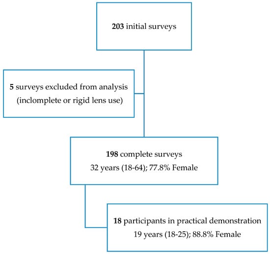 A total of 203 surveys were retrieved. Following manual review, five surveys were excluded, resulting in 198 complete surveys for analysis. Reasons for exclusion were incomplete or incongruous survey responses (3) and rigid corneal CL use (2). Participants had a median age of 32 years, with a range from 18 to 64 years, and were predominantly female (154, or 77.8%). A value of 71 (35.9%) respondents were aged 30 years or less, 74 (37.4%) between 31 and 40 years, and 53 (26.7%) were 41 years of age or older. Sex distribution amongst the three age groups was similar (p = 0.437).
