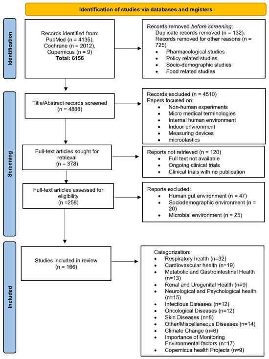 The initial search identified 6156 records from different individual keyword searches (Figure 1). The titles and abstracts of 4888 manuscripts were assessed and 4510 articles were removed following title and abstract screening. We found that most of the obtained articles were related to the internal human environment, indoor environment, non-human experiments, micro-medical terminologies, or measuring devices. This screening resulted in 378 papers that were screened for full text. Here, articles that were not possible to retrieve or include in the review were removed. These articles included those that did not have full text available, were ongoing clinical trials, or trials with no publication reporting the findings. A total of 258 articles were shortlisted for full-text eligibility after this phase. A thorough inspection of these articles resulted in the exclusion of 92 articles that were based on human genomes and gut bacteria environment, socio-demographic environment, and microbial environment. Finally, a total of 166 articles underwent a full-text review. This collection was then broken down into several categories, which were designed to facilitate the grouping of studies according to both shared and specific characteristics. The classification includes nine human health categories, Copernicus health projects (provided in Supplementary File S1), articles that were focused on the effect of climate change on human health, and articles with examples showing the importance of monitoring environmental factors.